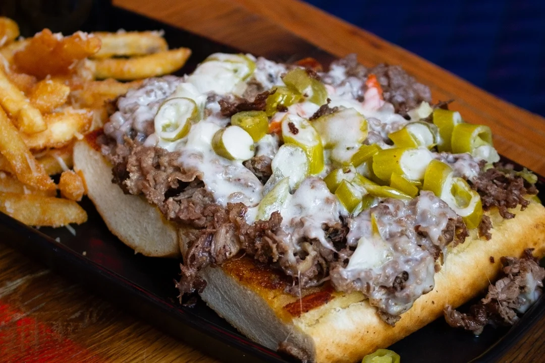 Chicago-style sliced Italian beef, mozzarella cheese, and spicy giardiniera