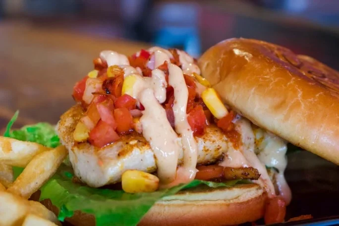 Blackened Mahi Mahi, topped with fresh sweet corn salsa, lettuce, tomato, and chipotle cream sauce, on a grilled brioche bun