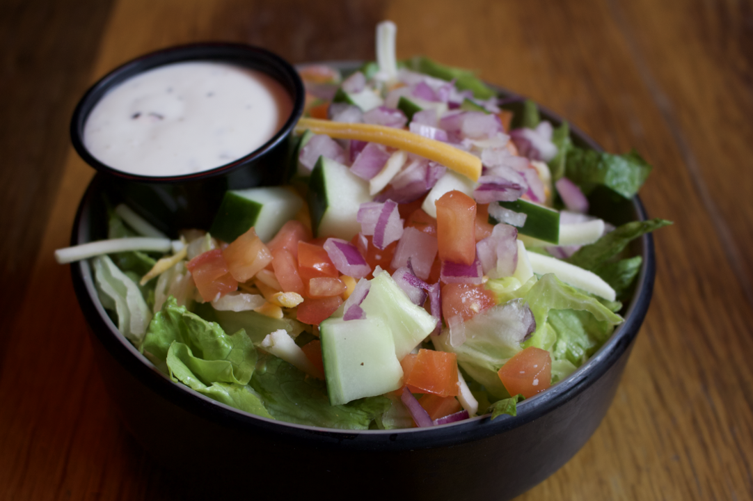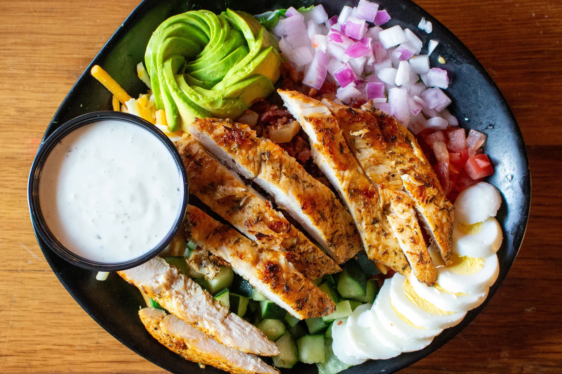Cobb's lettuce mix topped with grilled chicken, bacon, red onions, cucumber, tomatoes, avocado, cheddar cheese and ranch dressing.