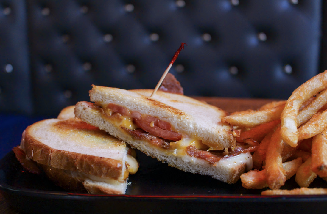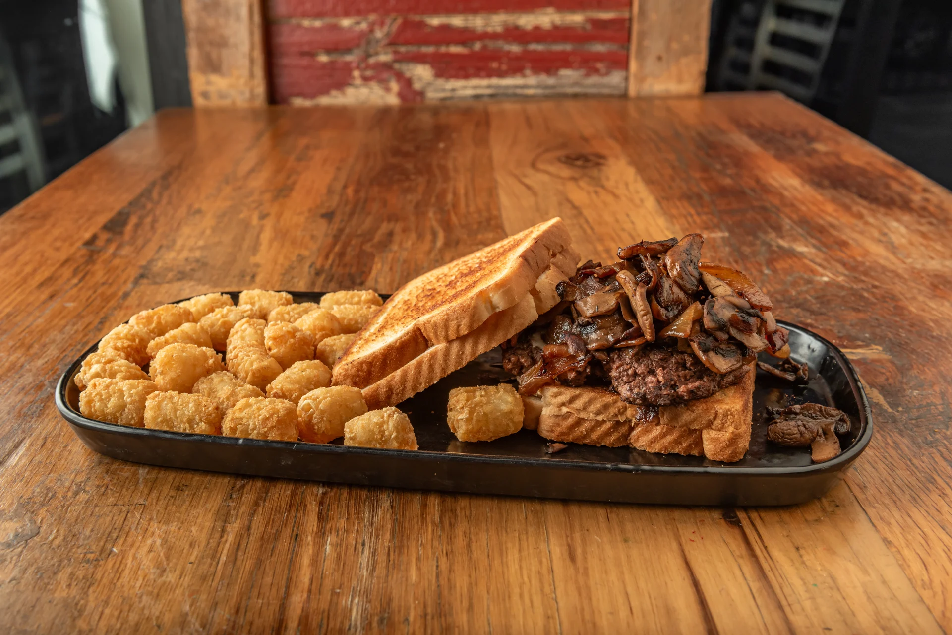 Grilled Onions, Mushrooms, Bacon and Swiss Served Between 2 Grilled Cheese Sandwiches. So darn good it's probably a crime!