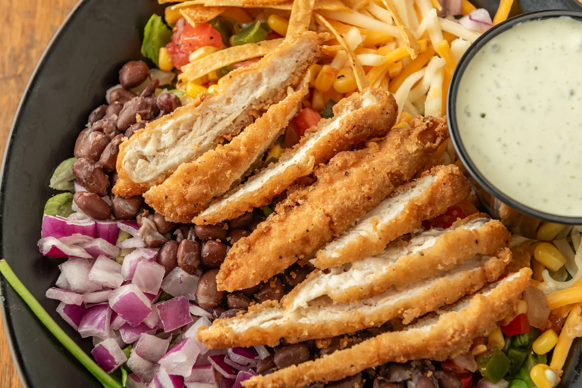 Cobb's lettuce mix topped with crispy fried chicken, black beans, sweet corn salsa, tortilla strips, cheddar, red onion and creamy cilantro-lime dressing.