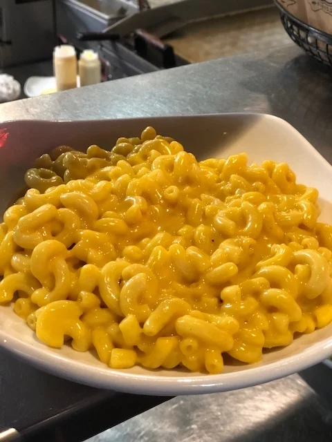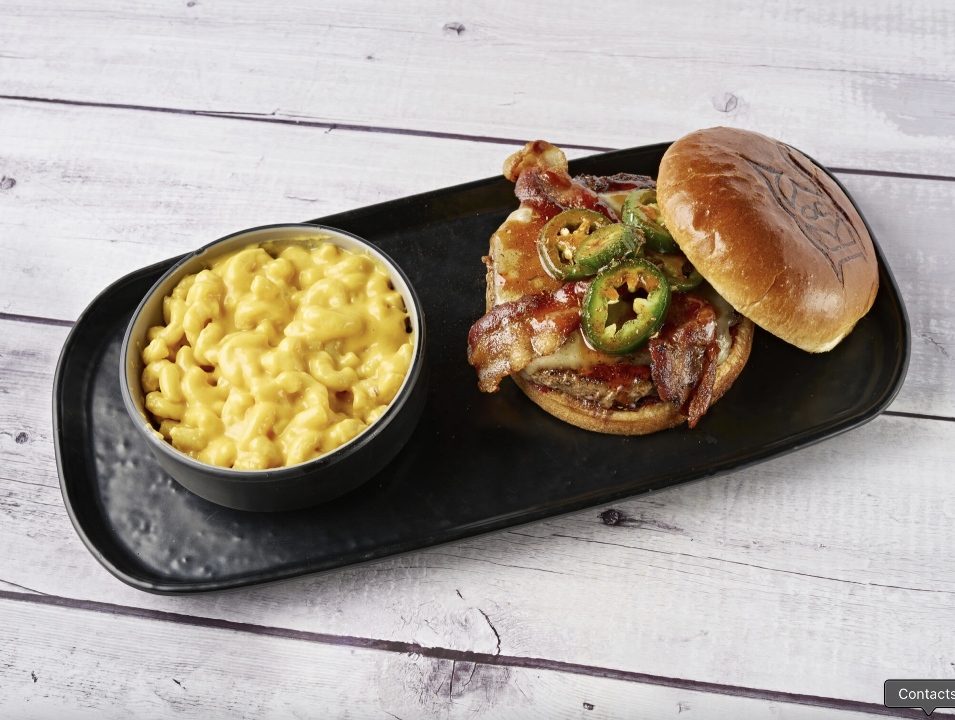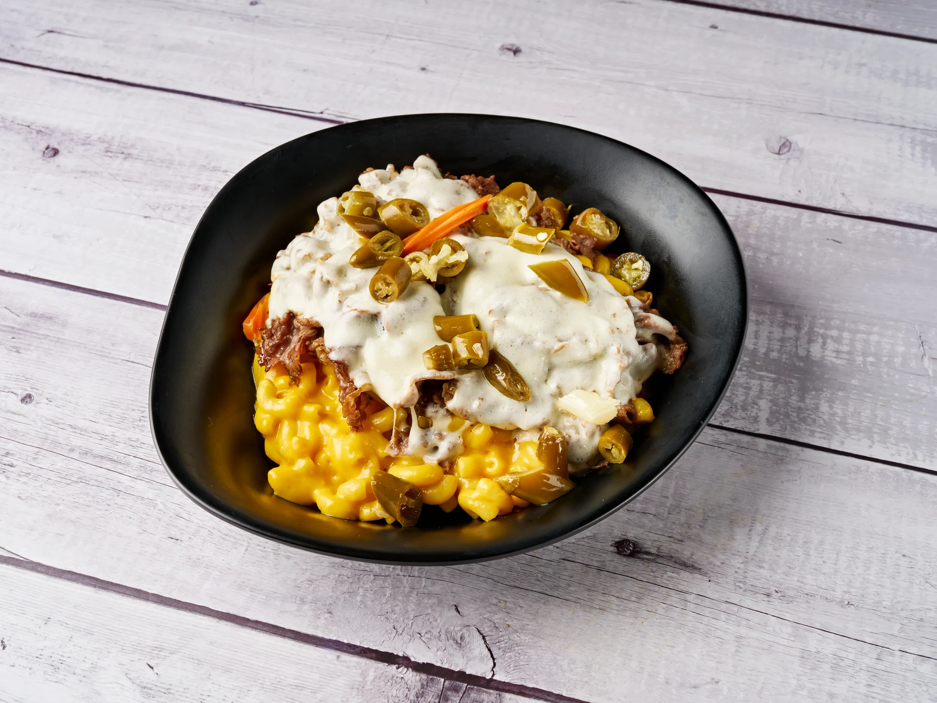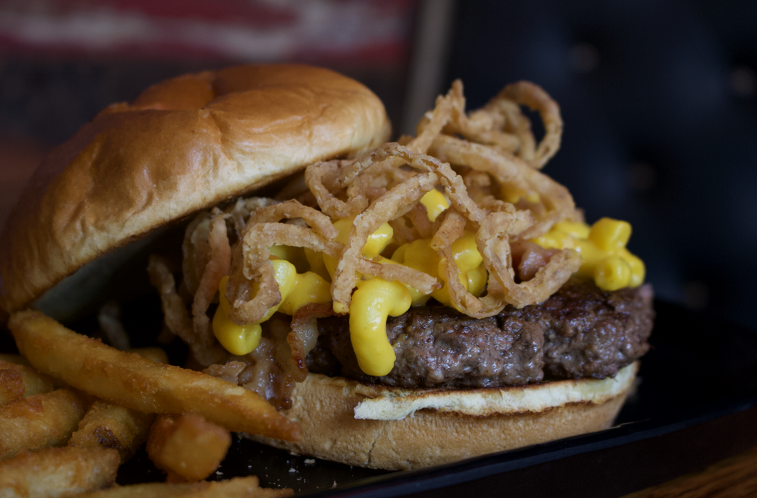 Mac & Cheese, Bacon, Onion Strings. So delicious, it will blow you away!