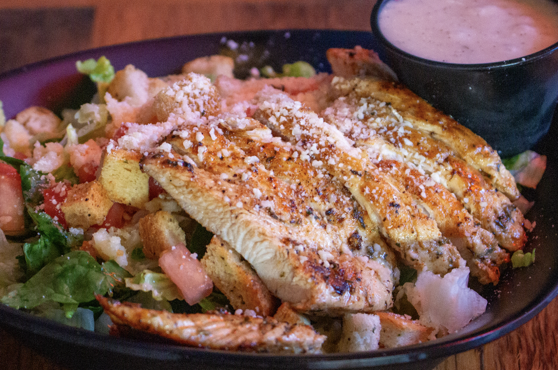 Romaine Lettuce, Grilled Chicken Breast, Parmesan Cheese, Homemade Garlic Croutons, and Freshly baked Asiago Cheese Chips. Served with Caesar Dressing on the side.