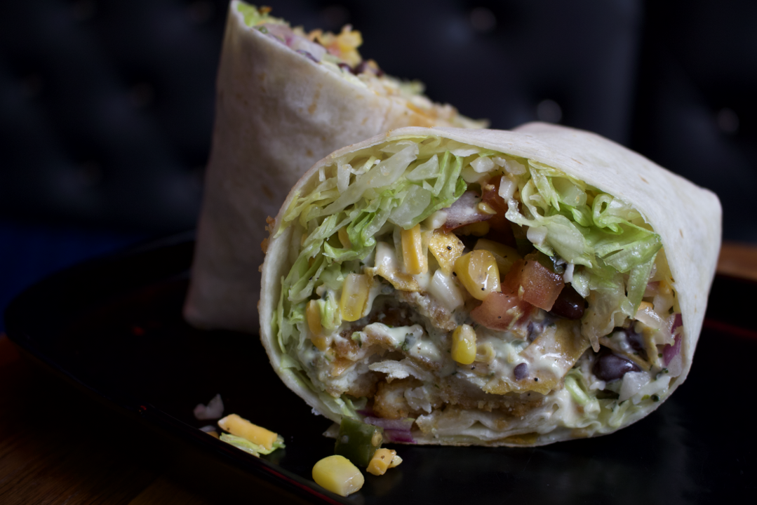 Crispy fried Chicken, lettuce, black beans, sweet corn salsa, tortilla strips, cheddar, red onion, and cilantro-lime dressing wrapped in a warm flour tortilla.