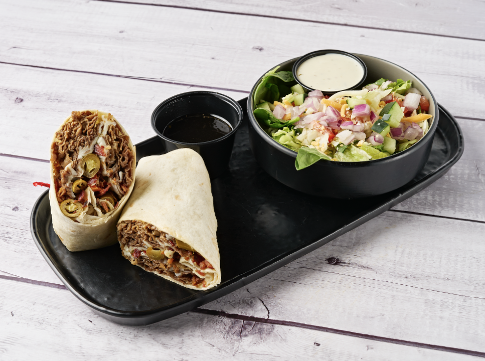 Thinly sliced Italian beef, melted mozzarella cheese, giardiniera and bacon wrapped in a warm flour tortilla.