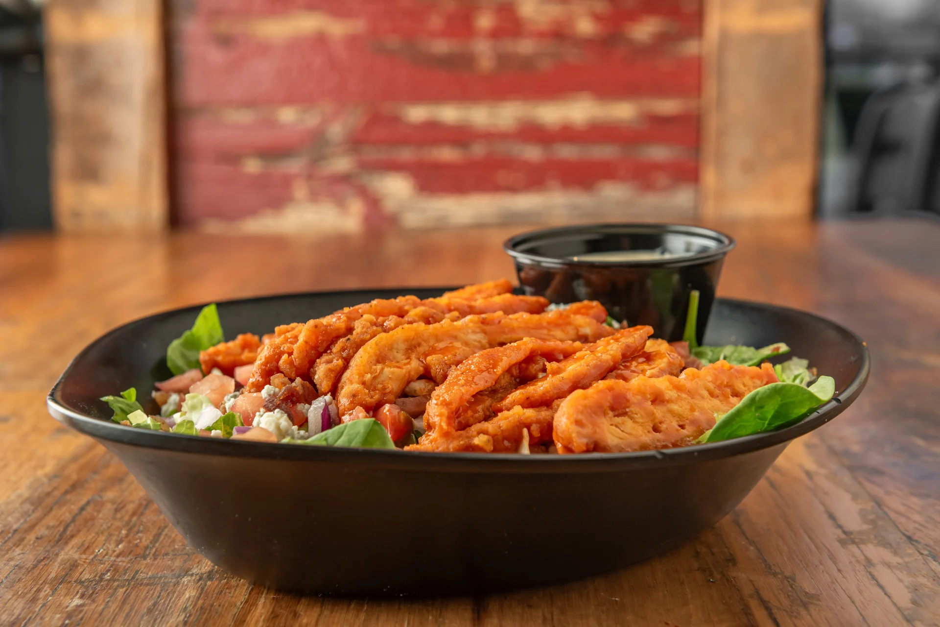 Cobb's Mixed Greens, crispy fried chicken tossed in Cobb's buffalo sauce, tomato, bacon, onion, bleu cheese crumbles, and creamy bleu cheese dressing.