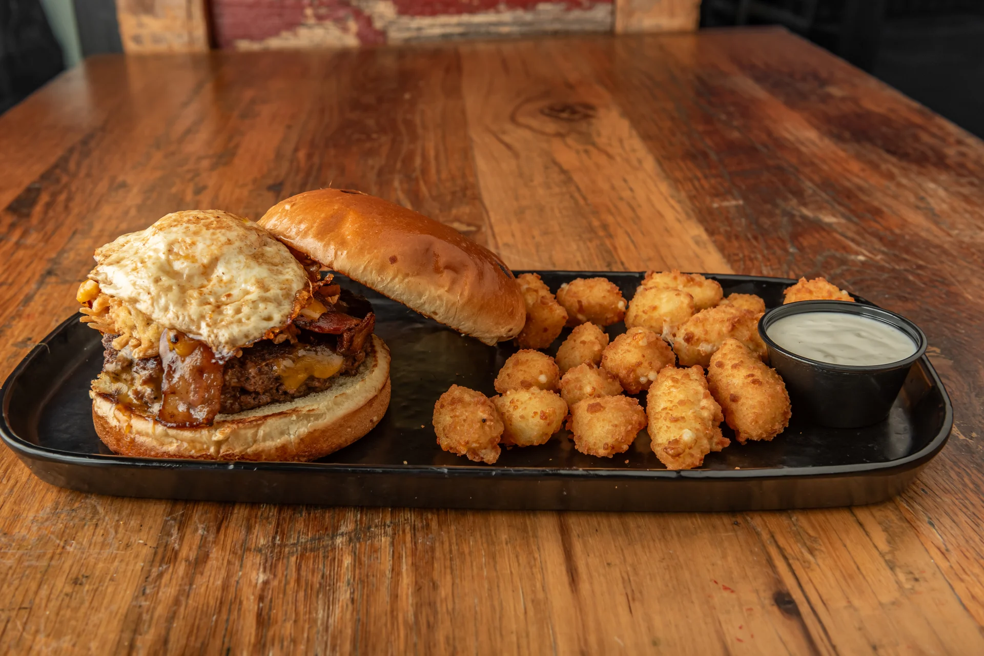 Pulled Pork, Fried Egg, Black Forest Ham, Onion Strings, BBQ, Jalapeños, on a Pretzel Bun. Finish this one on your way to the E.R.!