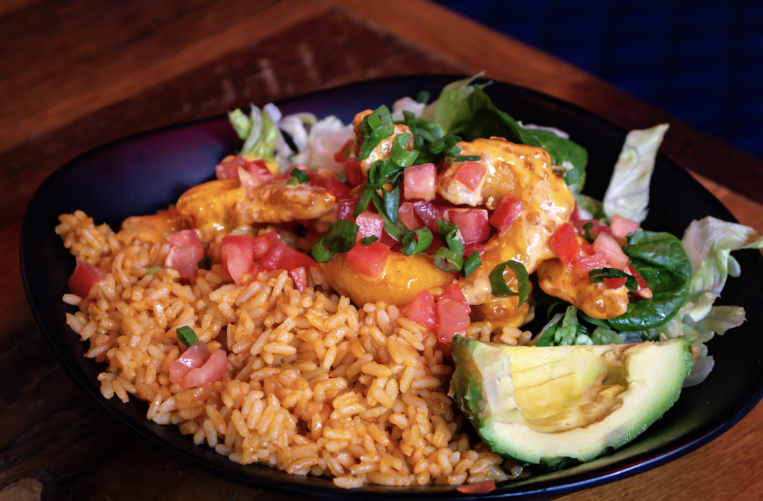 Cobb's Rice blend topped with breaded shrimp, iceberg lettuce, diced tomatoes, green onions & spicy dynamite sauce.