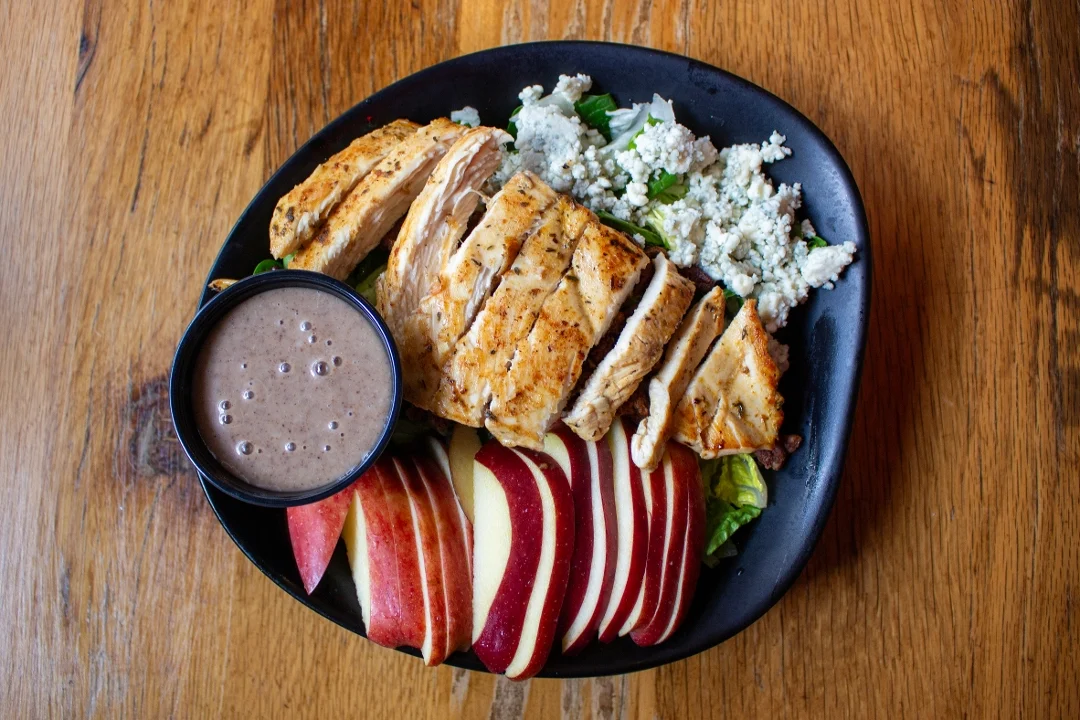 Romaine Lettuce, Grilled Chicken Breast, Sliced Apples, Bleu Cheese Crumbles, Candied Pecans. Served with Honey Pecan Vinaigrette on the side.