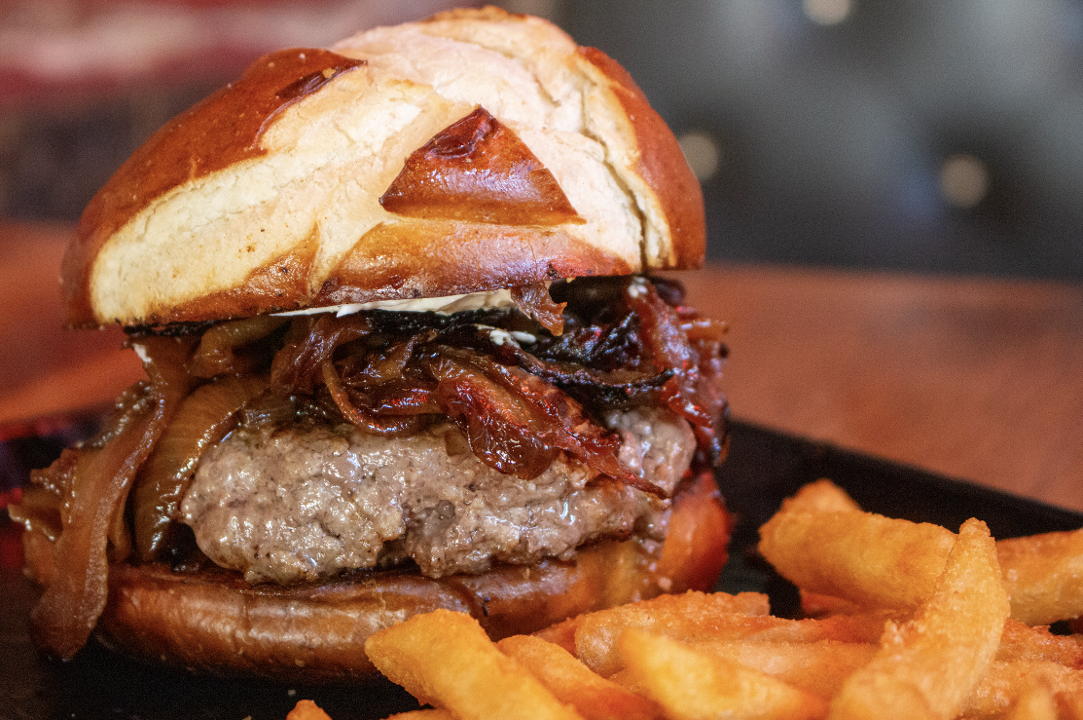 Caramelized Onion, White Truffle Pub Cheese, Served on a Pretzel Bun. Electrifyingly Delicious!