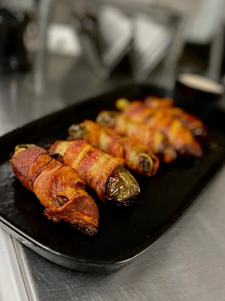 Fresh Jalapenos, Pepper Jack Cheese, Bacon, Cajun Seasoning, Honey-Sriracha Drizzle.