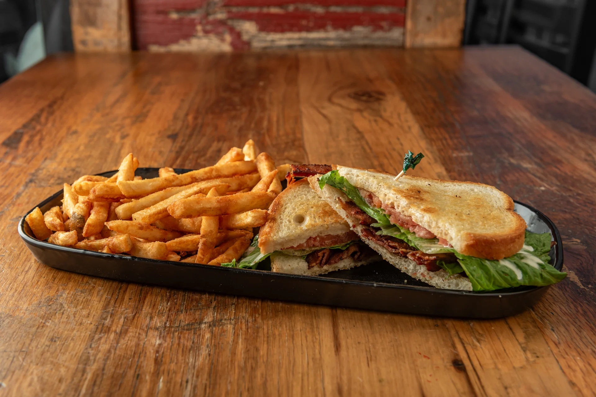 Our twist on a classic, bacon, lettuce and tomato served with our house garlic aioli, on grilled sourdough with your choice of side.