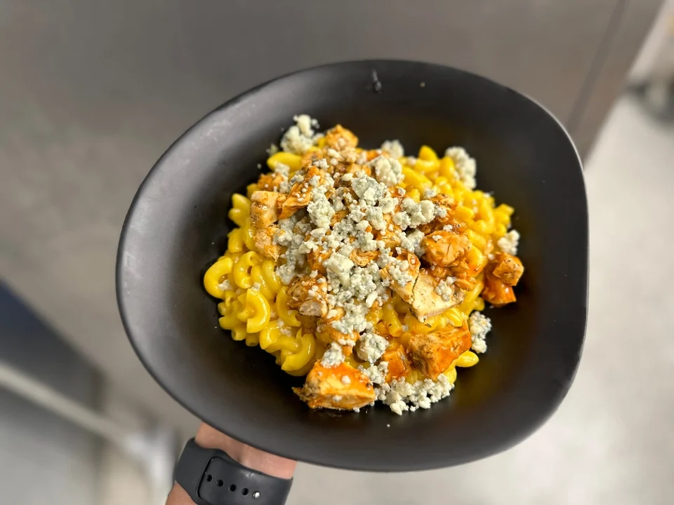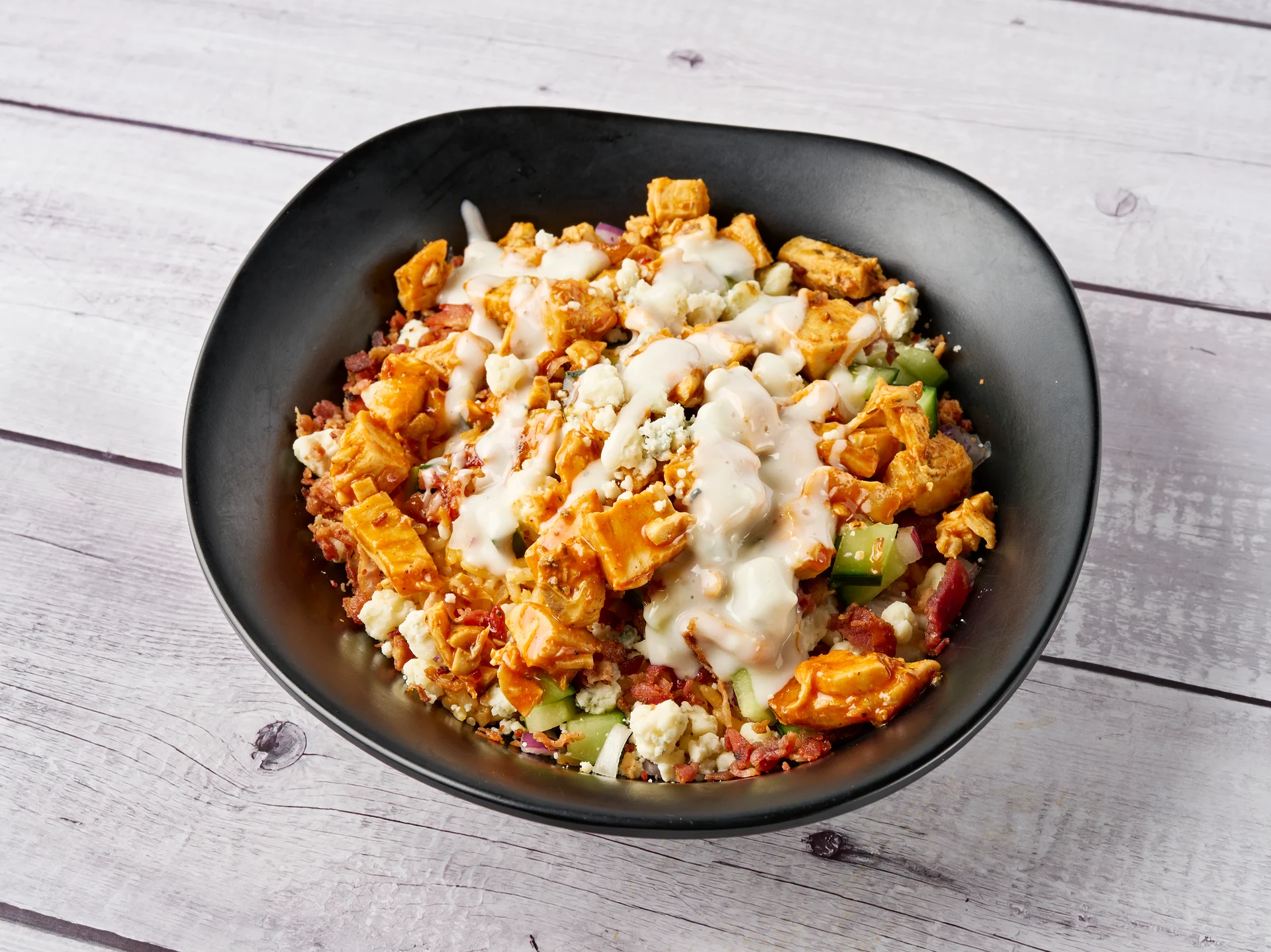 Bleu cheese crumbles, grilled chicken, and buffalo sauce drizzle.