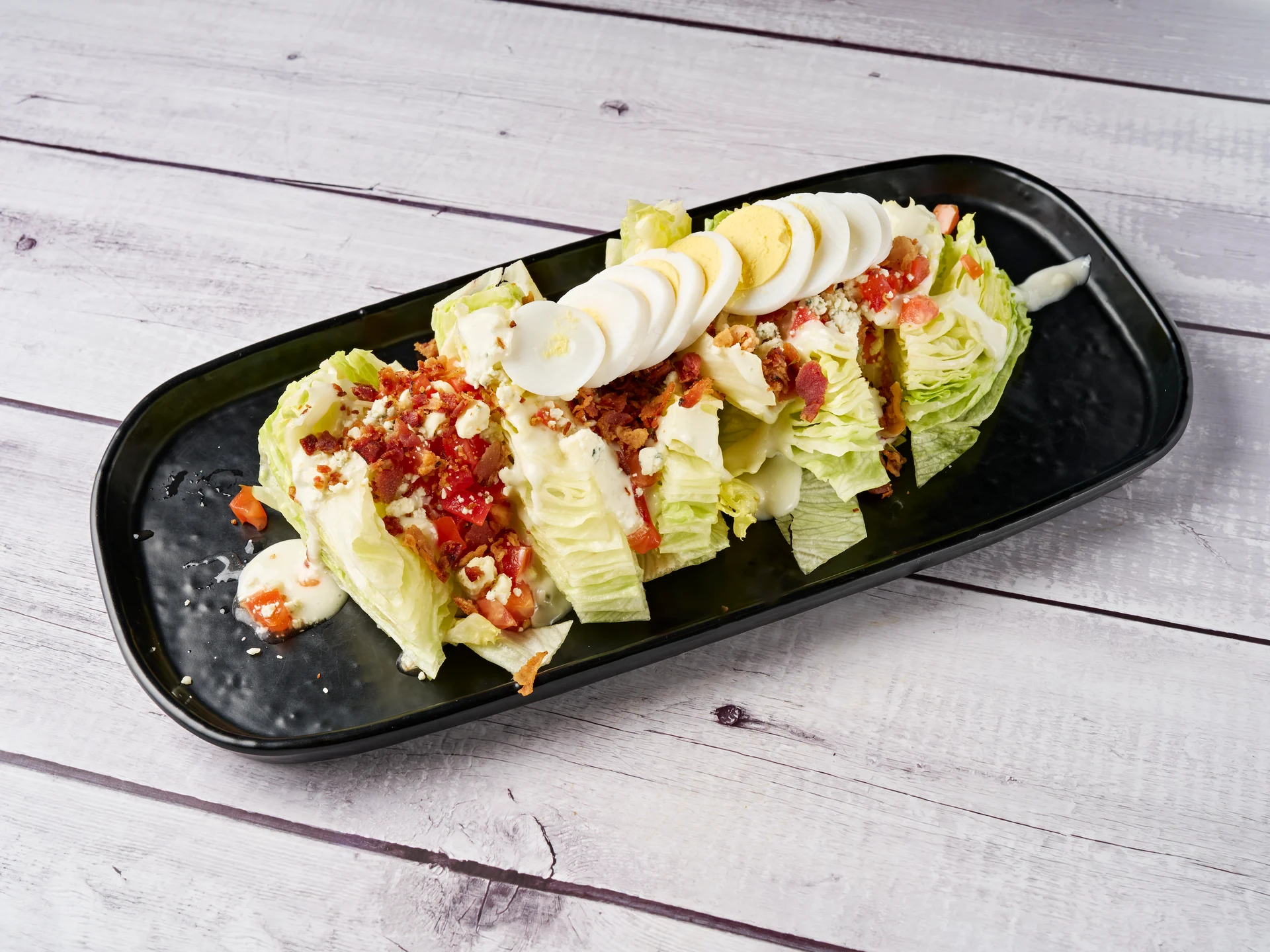 Half of an Iceberg Wedge topped with Bleu Cheese Dressing, Bleu Cheese Crumbles and Bacon